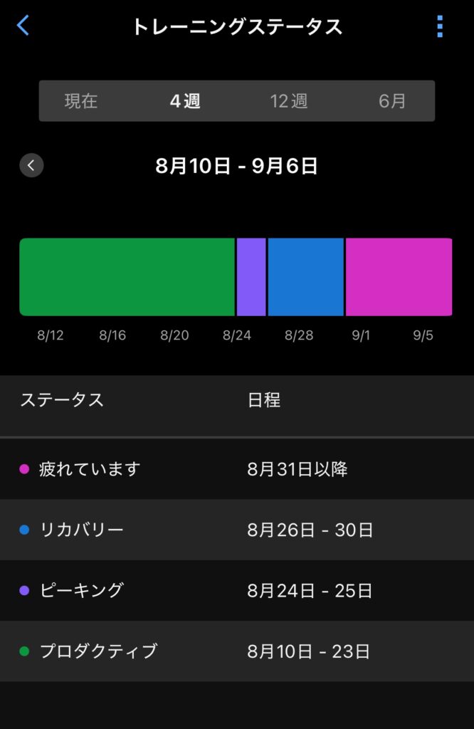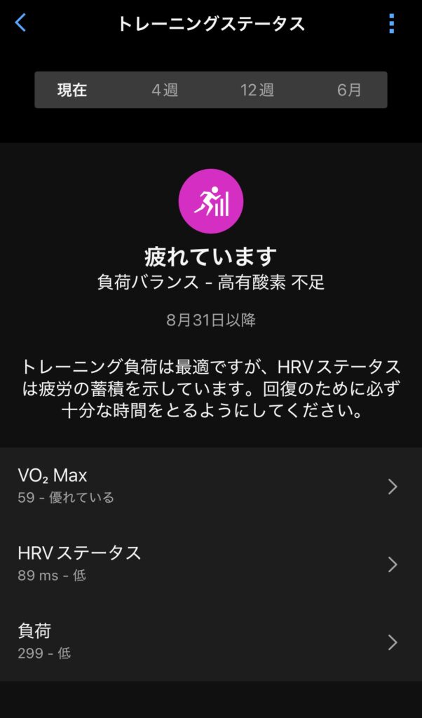 最初は調子がよく「このまま続けられる!」と思っていましたが、3〜4日前からGarminの「トレーニングステータス」に「疲れています、休養してください」と表示されるように😅